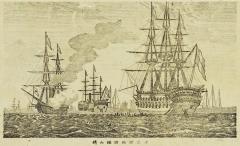 東京佃嶋遠望商船入津川蒸気出帆之圖 Sailing Ships at Tsukudajima, Tokyo